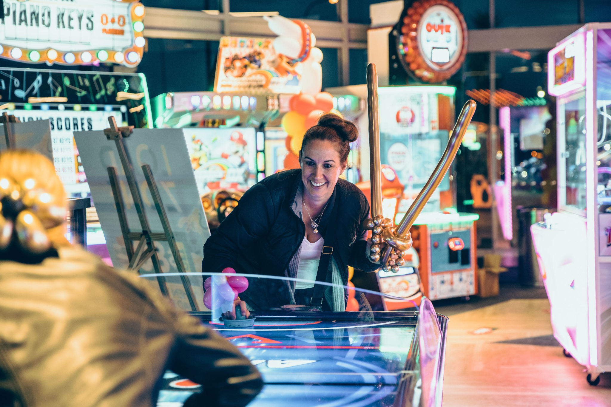 - Custom tenpin bowling and arcade-inspired balloon decor columns.